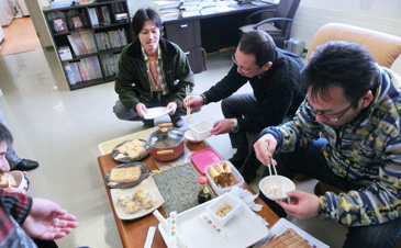 豆腐の製造と販売を始めて1年半が経過。 その間、お客さまからは「揚げはないの?」などの声がちらほらと・・・。 その声を聴いた製造スタッフは頑張りました。 先日、新しく「揚げ」「がんも」の試食会を行いました。 腕をふるって色々な加工品を調理。 一同、うまい! イケる! 新商品の販売まで、もう少しお待ちください!
