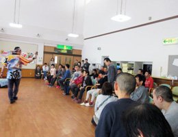 11月15日(金)。ご縁をいただき、和風大道芸人「太平洋」氏に来園いただきました。 けん玉から始まり、シガーボックス、皿回し、傘回し、バランス芸。 そして最後は、綱渡り! 見ている側はソワソワ、ドキドキし、「大丈夫?!」「気を付けてね !」等と心配の声が響く中、見事な芸を披露して下さいました。 普段あまり味わう事の出来ない緊張感に、利用者の皆さんも大興奮でした。